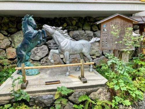 貴船神社には絵馬のルーツとして黒い馬と白い馬の像が置かれている。水の神に祈るにあたり、雨を降らせて欲しければ黒い馬を、雨を止めて欲しければ白い馬を奉納したとか。逆だったかな? ともかく本物の馬を奉納していたのを、経済的な理由からなのか信仰心…