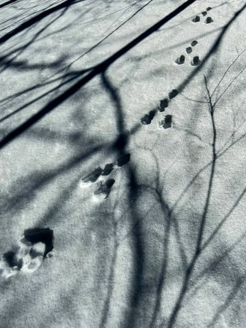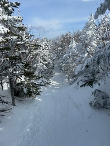 野うさぎの足あとが、あっちにも、こっちにもある。今年は雪が多いから、スノーハイク始めるにはいいタイミングだったようだ。そういえば昨年は雪がない、雪がないと嘆く声が聞こえた。おととしも雪が少なかったかもしれないが、スキーは数年に1回やるかどうか程度だし、スノボ未経験なので雪の多い少ないに興味なかった。スキー場には海外の観光客が殺到していると聞くから、近寄るまいと思っていたが、いまのところスノーハイクなら静かに自然を堪能できる。