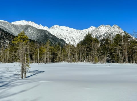 面白くなってきたので、1月にまたスノーシュー体験会に参加した。こんどは上高地。このへんは春夏秋すごい人出だけど、冬は車両が釜トンネルの手前までしか通行できないからスノーシューなどを装着して歩いてくるしかない。人がいなくてしーんと静まり返っている。ホテルも売店もトイレも冬季閉鎖されている。ウェストンが穂高とか登った頃は冬でも温泉宿を起点にできたはずだが、いまは野営するしかない。氷点下で野営なんかしたくないから通いで平坦な谷をぺたぺた歩く。もう転ばない。