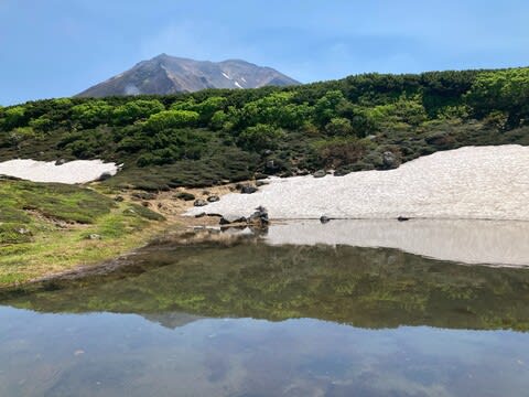 思えば高い山の夏は短く、梅雨入り前は残雪でスキーを楽しむ人がいるくらいだから歩き回るには不向きで、梅雨明けからせいぜい3か月が歩行可能なシーズンだが、人によってはお盆前までに時期を区切り、以降は寂しいから行かない派閥さえ存在するようだ。その流儀だと高山のベストシーズンは1か月たらず……夏場はもう気がはやり居ても立ってもいられないに違いない。昨年それに近い心境になり、北海道なら梅雨がないからと6月に大雪山へ行ったら少々まだ残雪があった。